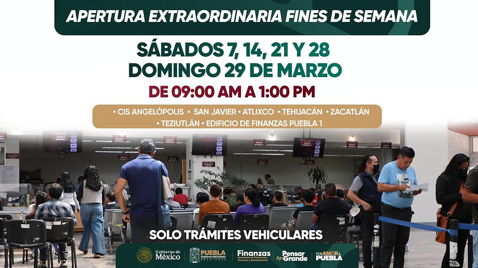 Cumpliendo con el compromiso de brindar una atención cercana, oportuna y eficiente, el Gobierno del Estado de Puebla, a través de la Secretaría de Planeación, Finanzas y Administración, informa que durante los fines de semana de marzo se realizará la apertura extraordinaria de oficinas recaudadoras, a fin de facilitar a la ciudadanía la realización de sus trámites vehiculares.